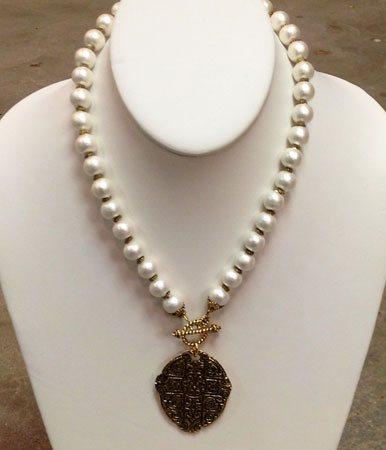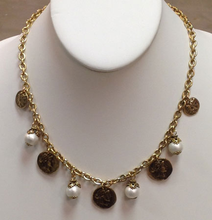 Cotton Ball Pearl/Antique Gold Roma Charm Necklace style no. N3684-063 :: $36 |